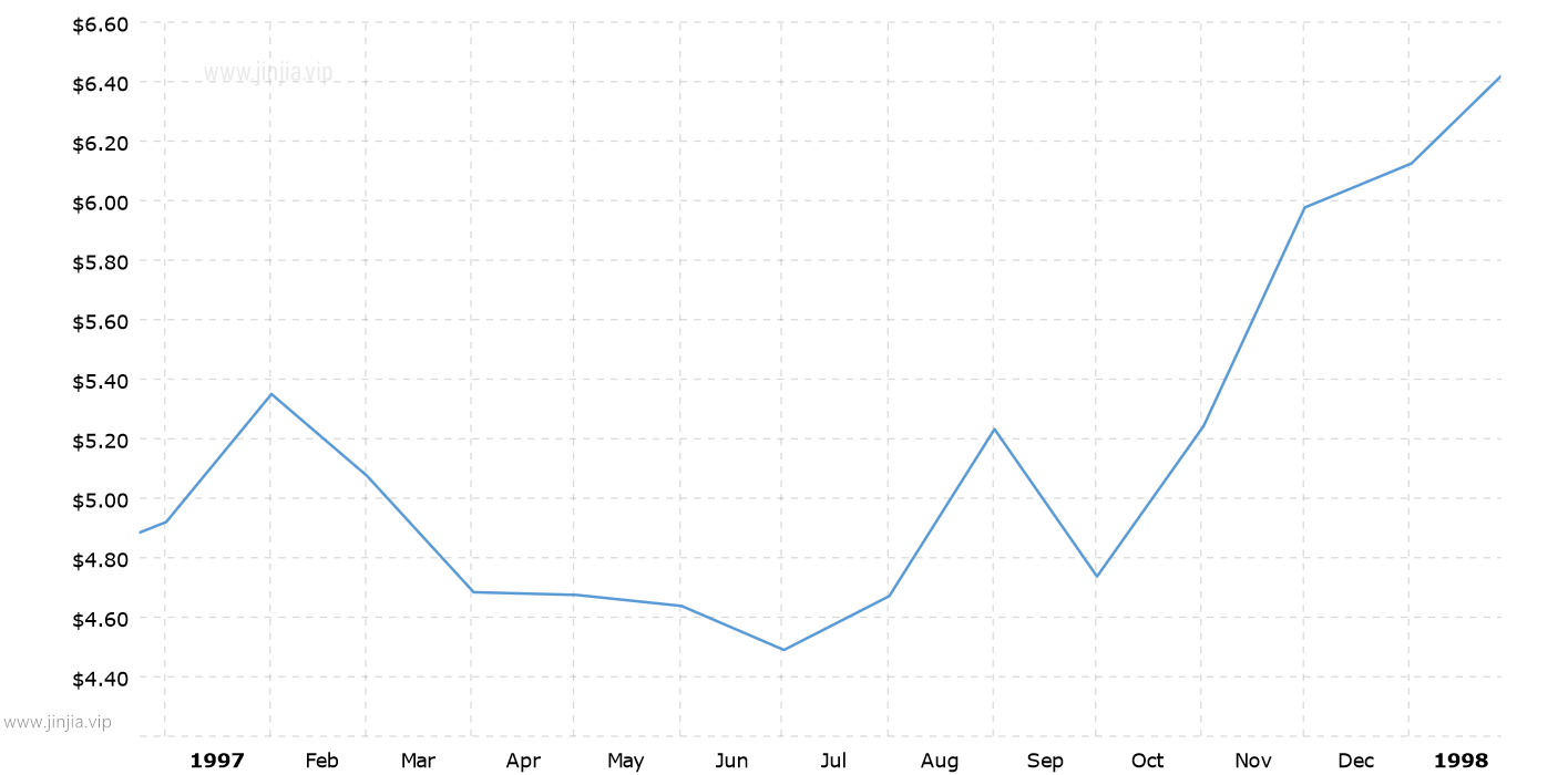 1997年銀價 1997年白銀價格走勢圖 報價單位:美元/盎司 白銀歷年價格查詢 請選取年份 2026年 2025年 2024年 2023年 2022年 2021年 2020年 2019年 2018年 2017年 2016年 2015年 2014年 2013年 2012年 2011年 2010年 2009年 2008年 2007年 2006年 2005年 2004年 2003年 2002年 2001年 2000年 1999年 1998年 1997年 1996年 1995年 1994年 1993年 1992年 1991年 1990年 1989年 1988年 1987年 1986年 1985年 1984年 1983年 1982年 1981年 1980年 1979年 1978年 1977年 1976年 1975年 1974年 1973年 1972年 1971年 1970年 1969年 1968年 1967年 1966年 1965年 1964年 1963年 1962年 1961年 1960年 1959年 1958年 1957年 1956年 1955年 1954年 1953年 1952年 1951年 1950年 1949年 1948年 1947年 1946年 1945年 1944年 1943年 1942年 1941年 1940年 1939年 1938年 1937年 1936年 1935年 1934年 1933年 1932年 1931年 1930年 1929年 1928年 1927年 1926年 1925年 1924年 1923年 1922年 1921年 1920年 1919年 1918年 1917年 1916年 1915年 國際白銀歷史價格走勢圖 半年 1年 10年 20年 30年 50年 1997年銀價查詢說明 1997年(民國86年)銀價走勢圖的數據來自英國倫敦黃金交易市場(Gold Market,International Gold Market)白銀的歷史價格,以美元每盎司計價,本站查詢對使用該1997白銀價格歷史圖和數據表導致的結果概不承擔任何責任。1997年金價 民國86年銀價相關數據參考 倫敦金 紐約金 上海金 歷年金價 歷年銀價 歷年鉑價 歷年鈀價 換算 銀價 鉑價 鈀價