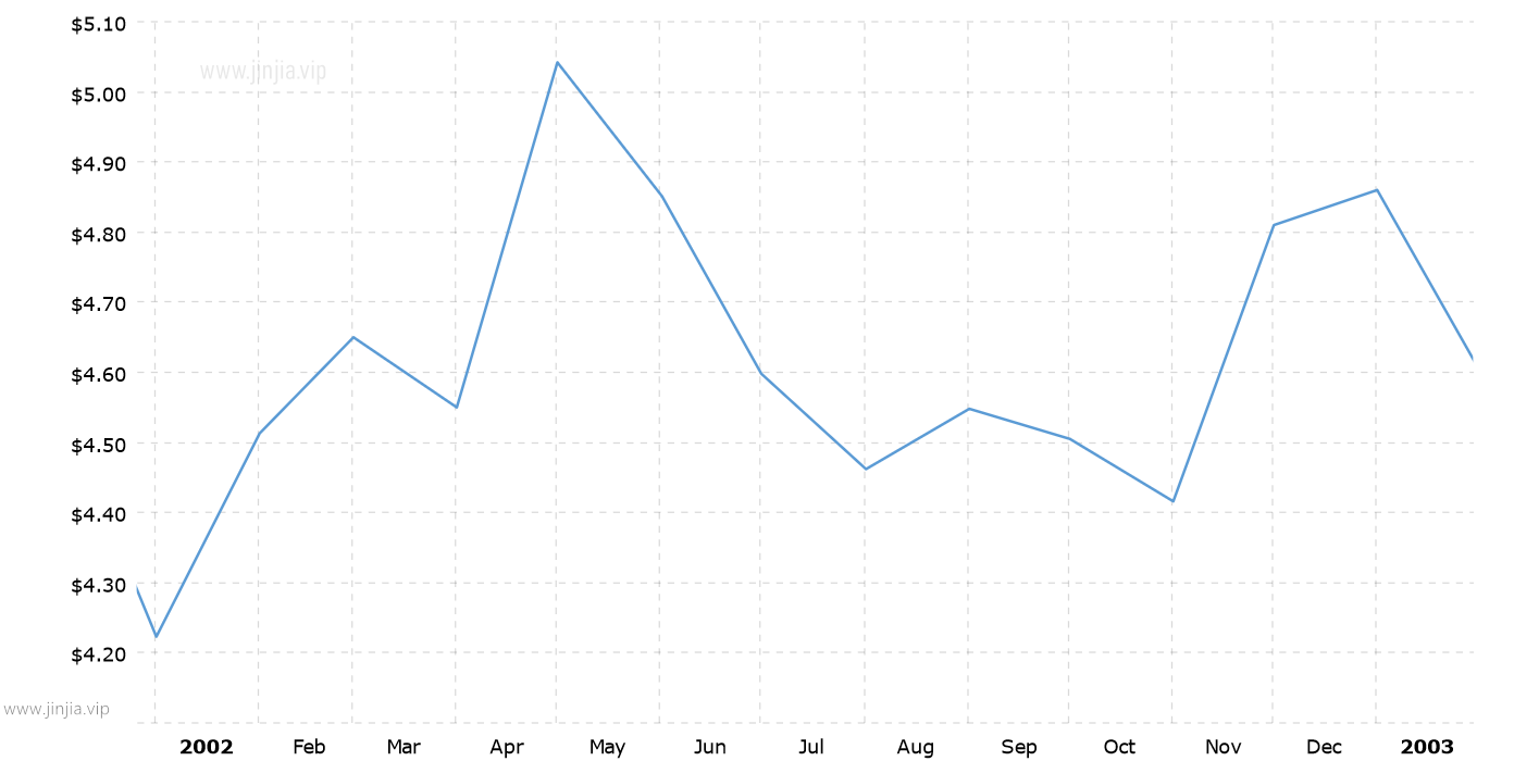 2002年銀價 2002年白銀價格走勢圖 報價單位:美元/盎司 白銀歷年價格查詢 請選取年份 2026年 2025年 2024年 2023年 2022年 2021年 2020年 2019年 2018年 2017年 2016年 2015年 2014年 2013年 2012年 2011年 2010年 2009年 2008年 2007年 2006年 2005年 2004年 2003年 2002年 2001年 2000年 1999年 1998年 1997年 1996年 1995年 1994年 1993年 1992年 1991年 1990年 1989年 1988年 1987年 1986年 1985年 1984年 1983年 1982年 1981年 1980年 1979年 1978年 1977年 1976年 1975年 1974年 1973年 1972年 1971年 1970年 1969年 1968年 1967年 1966年 1965年 1964年 1963年 1962年 1961年 1960年 1959年 1958年 1957年 1956年 1955年 1954年 1953年 1952年 1951年 1950年 1949年 1948年 1947年 1946年 1945年 1944年 1943年 1942年 1941年 1940年 1939年 1938年 1937年 1936年 1935年 1934年 1933年 1932年 1931年 1930年 1929年 1928年 1927年 1926年 1925年 1924年 1923年 1922年 1921年 1920年 1919年 1918年 1917年 1916年 1915年 國際白銀歷史價格走勢圖 半年 1年 10年 20年 30年 50年 2002年銀價查詢說明 2002年(民國91年)銀價走勢圖的數據來自英國倫敦黃金交易市場(Gold Market,International Gold Market)白銀的歷史價格,以美元每盎司計價,本站查詢對使用該2002白銀價格歷史圖和數據表導致的結果概不承擔任何責任。2002年金價 民國91年銀價相關數據參考 倫敦金 紐約金 上海金 歷年金價 歷年銀價 歷年鉑價 歷年鈀價 換算 銀價 鉑價 鈀價