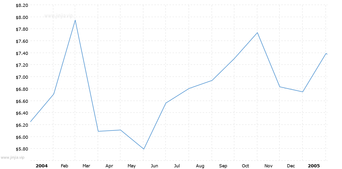 2004年銀價 2004年白銀價格走勢圖 報價單位:美元/盎司 白銀歷年價格查詢 請選取年份 2026年 2025年 2024年 2023年 2022年 2021年 2020年 2019年 2018年 2017年 2016年 2015年 2014年 2013年 2012年 2011年 2010年 2009年 2008年 2007年 2006年 2005年 2004年 2003年 2002年 2001年 2000年 1999年 1998年 1997年 1996年 1995年 1994年 1993年 1992年 1991年 1990年 1989年 1988年 1987年 1986年 1985年 1984年 1983年 1982年 1981年 1980年 1979年 1978年 1977年 1976年 1975年 1974年 1973年 1972年 1971年 1970年 1969年 1968年 1967年 1966年 1965年 1964年 1963年 1962年 1961年 1960年 1959年 1958年 1957年 1956年 1955年 1954年 1953年 1952年 1951年 1950年 1949年 1948年 1947年 1946年 1945年 1944年 1943年 1942年 1941年 1940年 1939年 1938年 1937年 1936年 1935年 1934年 1933年 1932年 1931年 1930年 1929年 1928年 1927年 1926年 1925年 1924年 1923年 1922年 1921年 1920年 1919年 1918年 1917年 1916年 1915年 國際白銀歷史價格走勢圖 半年 1年 10年 20年 30年 50年 2004年銀價查詢說明 2004年(民國93年)銀價走勢圖的數據來自英國倫敦黃金交易市場(Gold Market,International Gold Market)白銀的歷史價格,以美元每盎司計價,本站查詢對使用該2004白銀價格歷史圖和數據表導致的結果概不承擔任何責任。2004年金價 民國93年銀價相關數據參考 倫敦金 紐約金 上海金 歷年金價 歷年銀價 歷年鉑價 歷年鈀價 換算 銀價 鉑價 鈀價