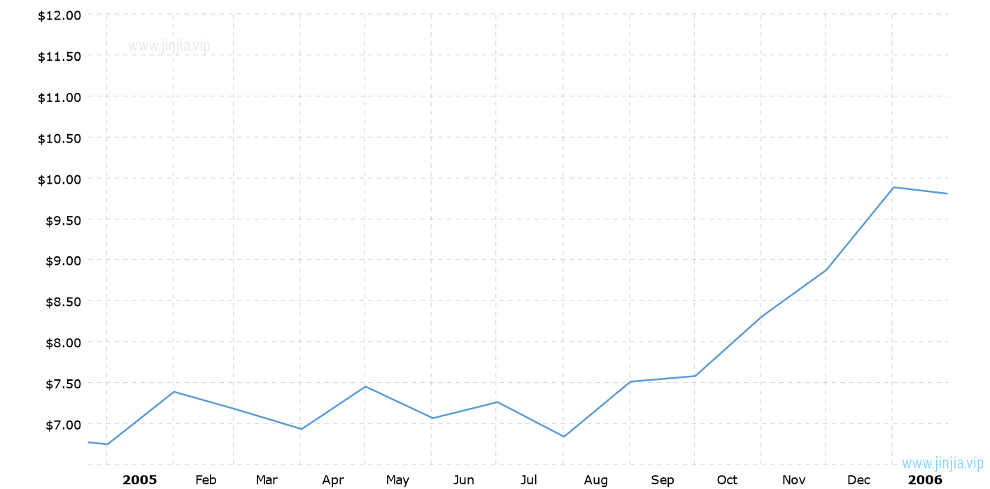 2005年銀價 2005年白銀價格走勢圖 報價單位:美元/盎司 白銀歷年價格查詢 請選取年份 2026年 2025年 2024年 2023年 2022年 2021年 2020年 2019年 2018年 2017年 2016年 2015年 2014年 2013年 2012年 2011年 2010年 2009年 2008年 2007年 2006年 2005年 2004年 2003年 2002年 2001年 2000年 1999年 1998年 1997年 1996年 1995年 1994年 1993年 1992年 1991年 1990年 1989年 1988年 1987年 1986年 1985年 1984年 1983年 1982年 1981年 1980年 1979年 1978年 1977年 1976年 1975年 1974年 1973年 1972年 1971年 1970年 1969年 1968年 1967年 1966年 1965年 1964年 1963年 1962年 1961年 1960年 1959年 1958年 1957年 1956年 1955年 1954年 1953年 1952年 1951年 1950年 1949年 1948年 1947年 1946年 1945年 1944年 1943年 1942年 1941年 1940年 1939年 1938年 1937年 1936年 1935年 1934年 1933年 1932年 1931年 1930年 1929年 1928年 1927年 1926年 1925年 1924年 1923年 1922年 1921年 1920年 1919年 1918年 1917年 1916年 1915年 國際白銀歷史價格走勢圖 半年 1年 10年 20年 30年 50年 2005年銀價查詢說明 2005年(民國94年)銀價走勢圖的數據來自英國倫敦黃金交易市場(Gold Market,International Gold Market)白銀的歷史價格,以美元每盎司計價,本站查詢對使用該2005白銀價格歷史圖和數據表導致的結果概不承擔任何責任。2005年金價 民國94年銀價相關數據參考 倫敦金 紐約金 上海金 歷年金價 歷年銀價 歷年鉑價 歷年鈀價 換算 銀價 鉑價 鈀價