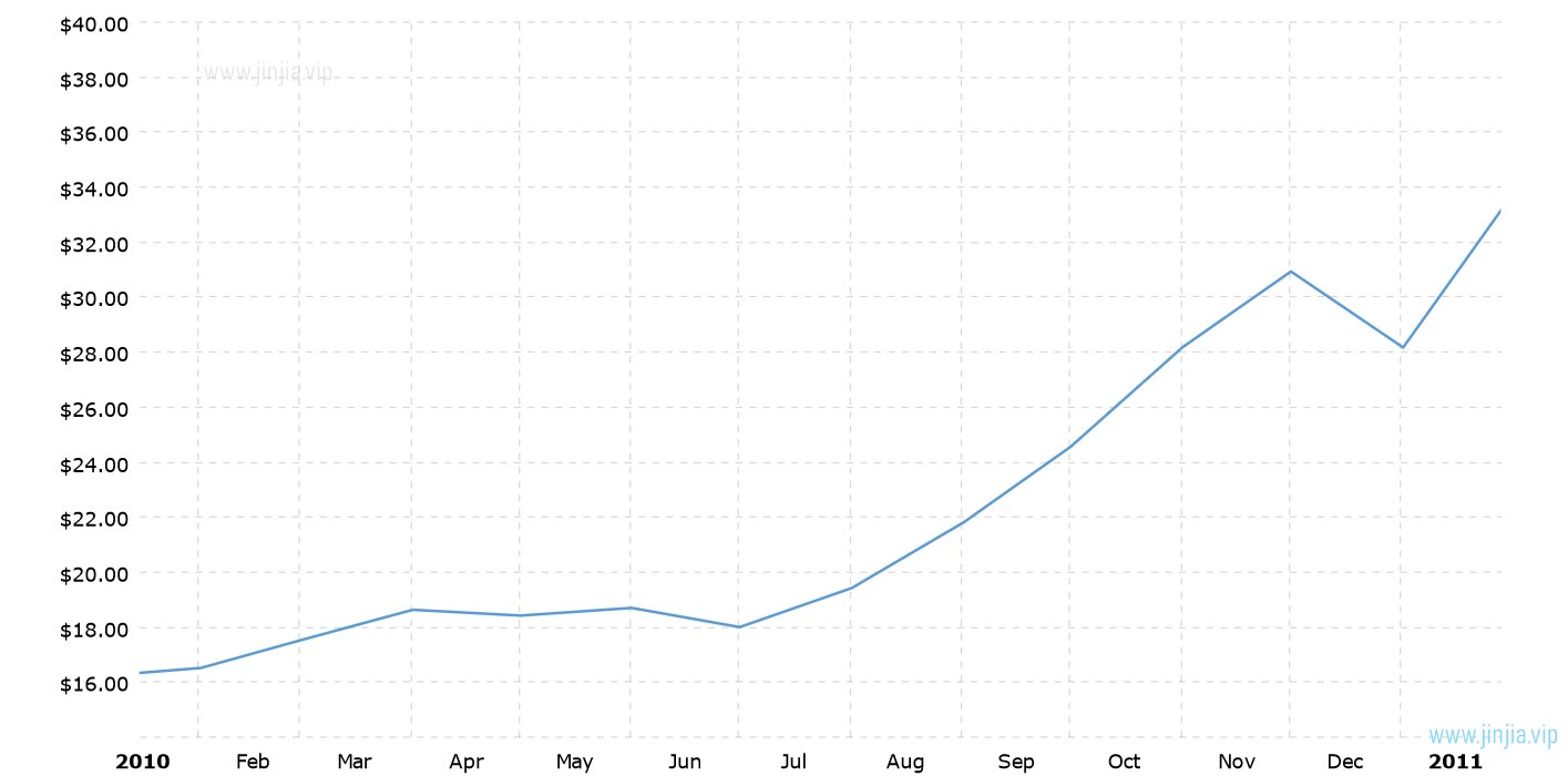 2010年銀價 2010年白銀價格走勢圖 報價單位:美元/盎司 白銀歷年價格查詢 請選取年份 2026年 2025年 2024年 2023年 2022年 2021年 2020年 2019年 2018年 2017年 2016年 2015年 2014年 2013年 2012年 2011年 2010年 2009年 2008年 2007年 2006年 2005年 2004年 2003年 2002年 2001年 2000年 1999年 1998年 1997年 1996年 1995年 1994年 1993年 1992年 1991年 1990年 1989年 1988年 1987年 1986年 1985年 1984年 1983年 1982年 1981年 1980年 1979年 1978年 1977年 1976年 1975年 1974年 1973年 1972年 1971年 1970年 1969年 1968年 1967年 1966年 1965年 1964年 1963年 1962年 1961年 1960年 1959年 1958年 1957年 1956年 1955年 1954年 1953年 1952年 1951年 1950年 1949年 1948年 1947年 1946年 1945年 1944年 1943年 1942年 1941年 1940年 1939年 1938年 1937年 1936年 1935年 1934年 1933年 1932年 1931年 1930年 1929年 1928年 1927年 1926年 1925年 1924年 1923年 1922年 1921年 1920年 1919年 1918年 1917年 1916年 1915年 國際白銀歷史價格走勢圖 半年 1年 10年 20年 30年 50年 2010年銀價查詢說明 2010年(民國99年)銀價走勢圖的數據來自英國倫敦黃金交易市場(Gold Market,International Gold Market)白銀的歷史價格,以美元每盎司計價,本站查詢對使用該2010白銀價格歷史圖和數據表導致的結果概不承擔任何責任。2010年金價 民國99年銀價相關數據參考 倫敦金 紐約金 上海金 歷年金價 歷年銀價 歷年鉑價 歷年鈀價 換算 銀價 鉑價 鈀價