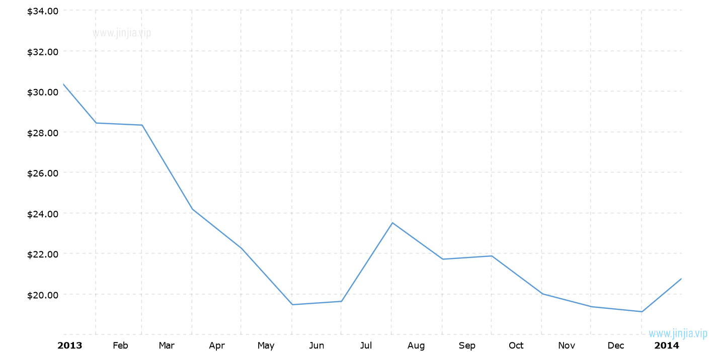 2013年銀價 2013年白銀價格走勢圖 報價單位:美元/盎司 白銀歷年價格查詢 請選取年份 2026年 2025年 2024年 2023年 2022年 2021年 2020年 2019年 2018年 2017年 2016年 2015年 2014年 2013年 2012年 2011年 2010年 2009年 2008年 2007年 2006年 2005年 2004年 2003年 2002年 2001年 2000年 1999年 1998年 1997年 1996年 1995年 1994年 1993年 1992年 1991年 1990年 1989年 1988年 1987年 1986年 1985年 1984年 1983年 1982年 1981年 1980年 1979年 1978年 1977年 1976年 1975年 1974年 1973年 1972年 1971年 1970年 1969年 1968年 1967年 1966年 1965年 1964年 1963年 1962年 1961年 1960年 1959年 1958年 1957年 1956年 1955年 1954年 1953年 1952年 1951年 1950年 1949年 1948年 1947年 1946年 1945年 1944年 1943年 1942年 1941年 1940年 1939年 1938年 1937年 1936年 1935年 1934年 1933年 1932年 1931年 1930年 1929年 1928年 1927年 1926年 1925年 1924年 1923年 1922年 1921年 1920年 1919年 1918年 1917年 1916年 1915年 國際白銀歷史價格走勢圖 半年 1年 10年 20年 30年 50年 2013年銀價查詢說明 2013年(民國102年)銀價走勢圖的數據來自英國倫敦黃金交易市場(Gold Market,International Gold Market)白銀的歷史價格,以美元每盎司計價,本站查詢對使用該2013白銀價格歷史圖和數據表導致的結果概不承擔任何責任。2013年金價 民國102年銀價相關數據參考 倫敦金 紐約金 上海金 歷年金價 歷年銀價 歷年鉑價 歷年鈀價 換算 銀價 鉑價 鈀價