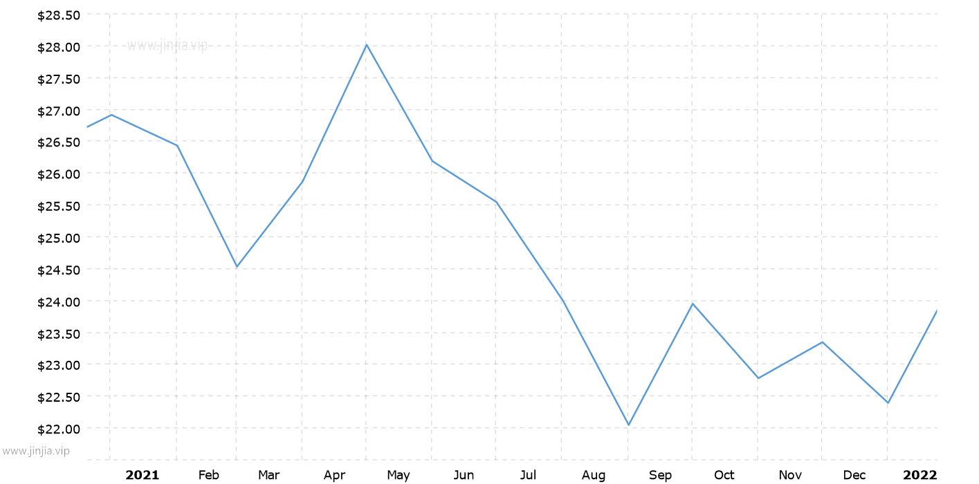2021年銀價 2021年白銀價格走勢圖 報價單位:美元/盎司 白銀歷年價格查詢 請選取年份 2026年 2025年 2024年 2023年 2022年 2021年 2020年 2019年 2018年 2017年 2016年 2015年 2014年 2013年 2012年 2011年 2010年 2009年 2008年 2007年 2006年 2005年 2004年 2003年 2002年 2001年 2000年 1999年 1998年 1997年 1996年 1995年 1994年 1993年 1992年 1991年 1990年 1989年 1988年 1987年 1986年 1985年 1984年 1983年 1982年 1981年 1980年 1979年 1978年 1977年 1976年 1975年 1974年 1973年 1972年 1971年 1970年 1969年 1968年 1967年 1966年 1965年 1964年 1963年 1962年 1961年 1960年 1959年 1958年 1957年 1956年 1955年 1954年 1953年 1952年 1951年 1950年 1949年 1948年 1947年 1946年 1945年 1944年 1943年 1942年 1941年 1940年 1939年 1938年 1937年 1936年 1935年 1934年 1933年 1932年 1931年 1930年 1929年 1928年 1927年 1926年 1925年 1924年 1923年 1922年 1921年 1920年 1919年 1918年 1917年 1916年 1915年 國際白銀歷史價格走勢圖 半年 1年 10年 20年 30年 50年 2021年銀價查詢說明 2021年(民國110年)銀價走勢圖的數據來自英國倫敦黃金交易市場(Gold Market,International Gold Market)白銀的歷史價格,以美元每盎司計價,本站查詢對使用該2021白銀價格歷史圖和數據表導致的結果概不承擔任何責任。2021年金價 民國110年銀價相關數據參考 倫敦金 紐約金 上海金 歷年金價 歷年銀價 歷年鉑價 歷年鈀價 換算 銀價 鉑價 鈀價