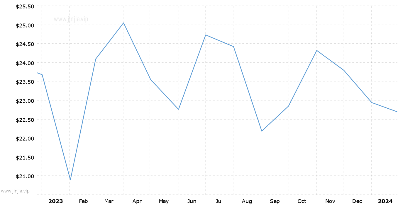2023年銀價 2023年白銀價格走勢圖 報價單位:美元/盎司 白銀歷年價格查詢 請選取年份 2026年 2025年 2024年 2023年 2022年 2021年 2020年 2019年 2018年 2017年 2016年 2015年 2014年 2013年 2012年 2011年 2010年 2009年 2008年 2007年 2006年 2005年 2004年 2003年 2002年 2001年 2000年 1999年 1998年 1997年 1996年 1995年 1994年 1993年 1992年 1991年 1990年 1989年 1988年 1987年 1986年 1985年 1984年 1983年 1982年 1981年 1980年 1979年 1978年 1977年 1976年 1975年 1974年 1973年 1972年 1971年 1970年 1969年 1968年 1967年 1966年 1965年 1964年 1963年 1962年 1961年 1960年 1959年 1958年 1957年 1956年 1955年 1954年 1953年 1952年 1951年 1950年 1949年 1948年 1947年 1946年 1945年 1944年 1943年 1942年 1941年 1940年 1939年 1938年 1937年 1936年 1935年 1934年 1933年 1932年 1931年 1930年 1929年 1928年 1927年 1926年 1925年 1924年 1923年 1922年 1921年 1920年 1919年 1918年 1917年 1916年 1915年 國際白銀歷史價格走勢圖 半年 1年 10年 20年 30年 50年 2023年銀價查詢說明 2023年(民國112年)銀價走勢圖的數據來自英國倫敦黃金交易市場(Gold Market,International Gold Market)白銀的歷史價格,以美元每盎司計價,本站查詢對使用該2023白銀價格歷史圖和數據表導致的結果概不承擔任何責任。2023年金價 民國112年銀價相關數據參考 倫敦金 紐約金 上海金 歷年金價 歷年銀價 歷年鉑價 歷年鈀價 換算 銀價 鉑價 鈀價