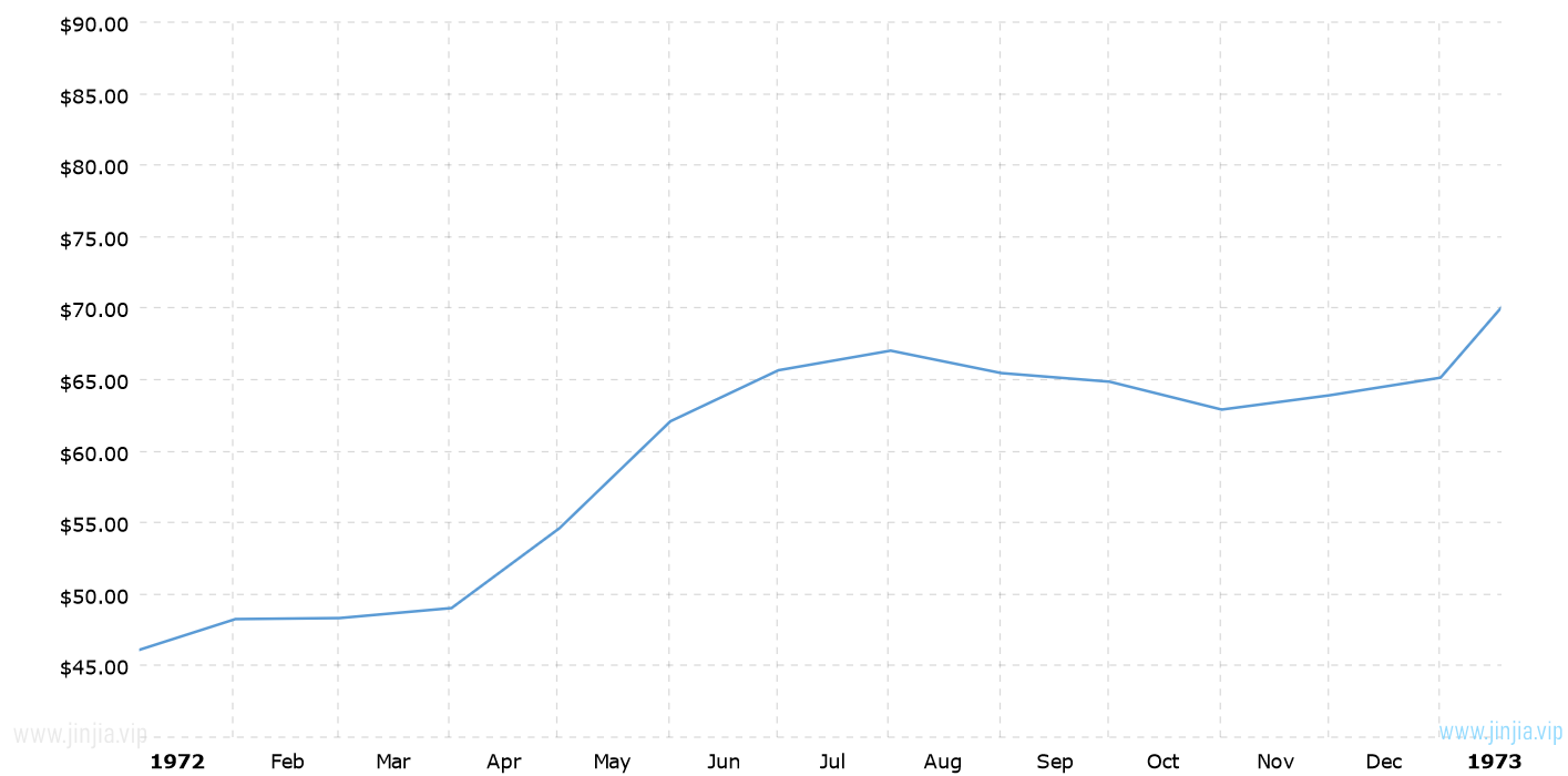 1972年金價 1972年黃金價格走勢圖 報價單位:美元/盎司 黃金歷年價格查詢 請選取年份 2026年 2025年 2024年 2023年 2022年 2021年 2020年 2019年 2018年 2017年 2016年 2015年 2014年 2013年 2012年 2011年 2010年 2009年 2008年 2007年 2006年 2005年 2004年 2003年 2002年 2001年 2000年 1999年 1998年 1997年 1996年 1995年 1994年 1993年 1992年 1991年 1990年 1989年 1988年 1987年 1986年 1985年 1984年 1983年 1982年 1981年 1980年 1979年 1978年 1977年 1976年 1975年 1974年 1973年 1972年 1971年 1970年 1969年 1968年 1967年 1966年 1965年 1964年 1963年 1962年 1961年 1960年 1959年 1958年 1957年 1956年 1955年 1954年 1953年 1952年 1951年 1950年 1949年 1948年 1947年 1946年 1945年 1944年 1943年 1942年 1941年 1940年 1939年 1938年 1937年 1936年 1935年 1934年 1933年 1932年 1931年 1930年 1929年 1928年 1927年 1926年 1925年 1924年 1923年 1922年 1921年 1920年 1919年 1918年 1917年 1916年 1915年 國際黃金歷史價格走勢圖 半年 1年 10年 20年 30年 50年 1972年金價查詢說明 1972年(民國61年)金價走勢圖的數據來自英國倫敦黃金交易市場(Gold Market,International Gold Market)的現貨歷史金價,以美元每盎司計價,本站查詢對使用該1972黃金價格歷史圖和數據表導致的結果概不承擔任何責任。 民國61年金價相關數據參考 倫敦金 紐約金 上海金 歷年金價 歷年銀價 歷年鉑價 歷年鈀價 換算 銀價 鉑價 鈀價
