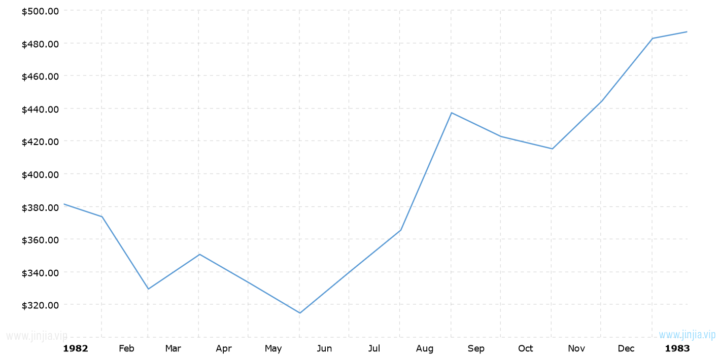 1982年金價 1982年黃金價格走勢圖 報價單位:美元/盎司 黃金歷年價格查詢 請選取年份 2026年 2025年 2024年 2023年 2022年 2021年 2020年 2019年 2018年 2017年 2016年 2015年 2014年 2013年 2012年 2011年 2010年 2009年 2008年 2007年 2006年 2005年 2004年 2003年 2002年 2001年 2000年 1999年 1998年 1997年 1996年 1995年 1994年 1993年 1992年 1991年 1990年 1989年 1988年 1987年 1986年 1985年 1984年 1983年 1982年 1981年 1980年 1979年 1978年 1977年 1976年 1975年 1974年 1973年 1972年 1971年 1970年 1969年 1968年 1967年 1966年 1965年 1964年 1963年 1962年 1961年 1960年 1959年 1958年 1957年 1956年 1955年 1954年 1953年 1952年 1951年 1950年 1949年 1948年 1947年 1946年 1945年 1944年 1943年 1942年 1941年 1940年 1939年 1938年 1937年 1936年 1935年 1934年 1933年 1932年 1931年 1930年 1929年 1928年 1927年 1926年 1925年 1924年 1923年 1922年 1921年 1920年 1919年 1918年 1917年 1916年 1915年 國際黃金歷史價格走勢圖 半年 1年 10年 20年 30年 50年 1982年金價查詢說明 1982年(民國71年)金價走勢圖的數據來自英國倫敦黃金交易市場(Gold Market,International Gold Market)的現貨歷史金價,以美元每盎司計價,本站查詢對使用該1982黃金價格歷史圖和數據表導致的結果概不承擔任何責任。 民國71年金價相關數據參考 倫敦金 紐約金 上海金 歷年金價 歷年銀價 歷年鉑價 歷年鈀價 換算 銀價 鉑價 鈀價