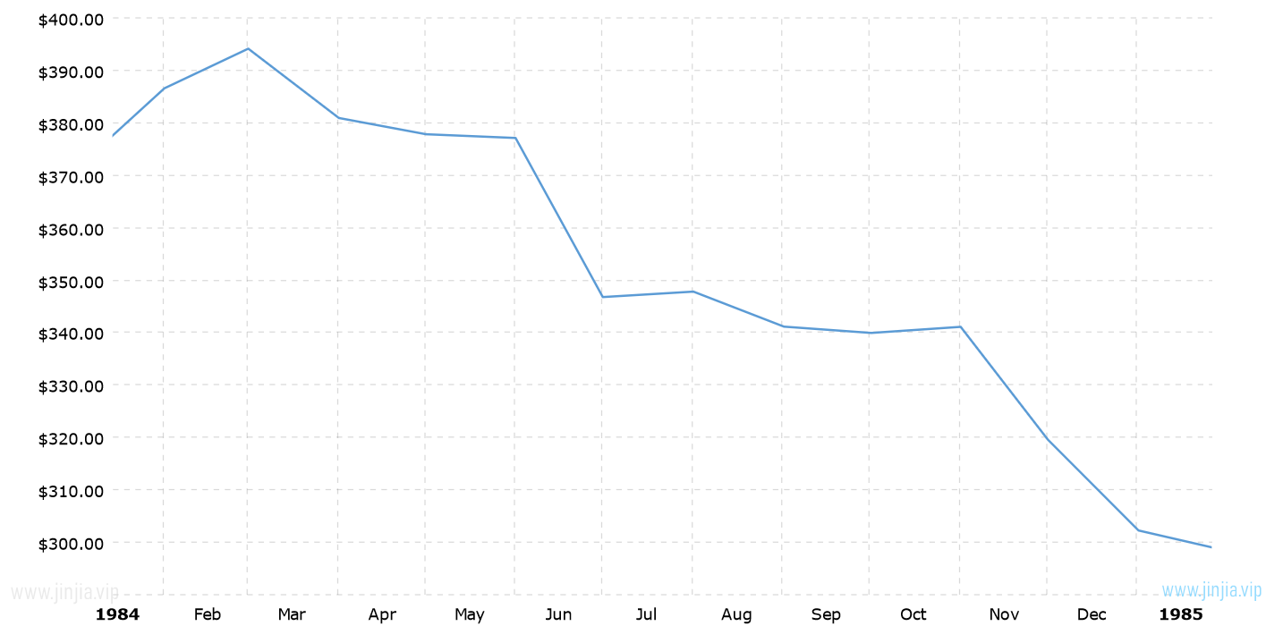 1984年金價 1984年黃金價格走勢圖 報價單位:美元/盎司 黃金歷年價格查詢 請選取年份 2026年 2025年 2024年 2023年 2022年 2021年 2020年 2019年 2018年 2017年 2016年 2015年 2014年 2013年 2012年 2011年 2010年 2009年 2008年 2007年 2006年 2005年 2004年 2003年 2002年 2001年 2000年 1999年 1998年 1997年 1996年 1995年 1994年 1993年 1992年 1991年 1990年 1989年 1988年 1987年 1986年 1985年 1984年 1983年 1982年 1981年 1980年 1979年 1978年 1977年 1976年 1975年 1974年 1973年 1972年 1971年 1970年 1969年 1968年 1967年 1966年 1965年 1964年 1963年 1962年 1961年 1960年 1959年 1958年 1957年 1956年 1955年 1954年 1953年 1952年 1951年 1950年 1949年 1948年 1947年 1946年 1945年 1944年 1943年 1942年 1941年 1940年 1939年 1938年 1937年 1936年 1935年 1934年 1933年 1932年 1931年 1930年 1929年 1928年 1927年 1926年 1925年 1924年 1923年 1922年 1921年 1920年 1919年 1918年 1917年 1916年 1915年 國際黃金歷史價格走勢圖 半年 1年 10年 20年 30年 50年 1984年金價查詢說明 1984年(民國73年)金價走勢圖的數據來自英國倫敦黃金交易市場(Gold Market,International Gold Market)的現貨歷史金價,以美元每盎司計價,本站查詢對使用該1984黃金價格歷史圖和數據表導致的結果概不承擔任何責任。 民國73年金價相關數據參考 倫敦金 紐約金 上海金 歷年金價 歷年銀價 歷年鉑價 歷年鈀價 換算 銀價 鉑價 鈀價