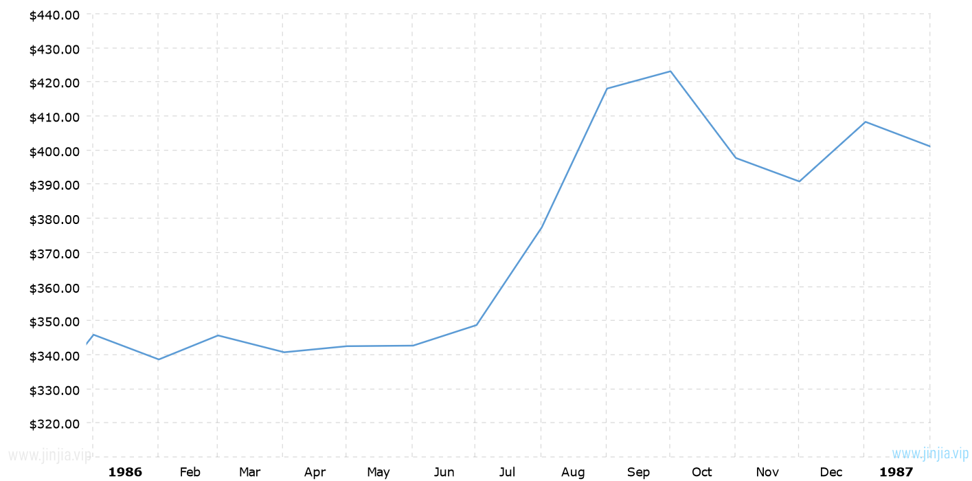 1986年金價 1986年黃金價格走勢圖 報價單位:美元/盎司 黃金歷年價格查詢 請選取年份 2026年 2025年 2024年 2023年 2022年 2021年 2020年 2019年 2018年 2017年 2016年 2015年 2014年 2013年 2012年 2011年 2010年 2009年 2008年 2007年 2006年 2005年 2004年 2003年 2002年 2001年 2000年 1999年 1998年 1997年 1996年 1995年 1994年 1993年 1992年 1991年 1990年 1989年 1988年 1987年 1986年 1985年 1984年 1983年 1982年 1981年 1980年 1979年 1978年 1977年 1976年 1975年 1974年 1973年 1972年 1971年 1970年 1969年 1968年 1967年 1966年 1965年 1964年 1963年 1962年 1961年 1960年 1959年 1958年 1957年 1956年 1955年 1954年 1953年 1952年 1951年 1950年 1949年 1948年 1947年 1946年 1945年 1944年 1943年 1942年 1941年 1940年 1939年 1938年 1937年 1936年 1935年 1934年 1933年 1932年 1931年 1930年 1929年 1928年 1927年 1926年 1925年 1924年 1923年 1922年 1921年 1920年 1919年 1918年 1917年 1916年 1915年 國際黃金歷史價格走勢圖 半年 1年 10年 20年 30年 50年 1986年金價查詢說明 1986年(民國75年)金價走勢圖的數據來自英國倫敦黃金交易市場(Gold Market,International Gold Market)的現貨歷史金價,以美元每盎司計價,本站查詢對使用該1986黃金價格歷史圖和數據表導致的結果概不承擔任何責任。 民國75年金價相關數據參考 倫敦金 紐約金 上海金 歷年金價 歷年銀價 歷年鉑價 歷年鈀價 換算 銀價 鉑價 鈀價