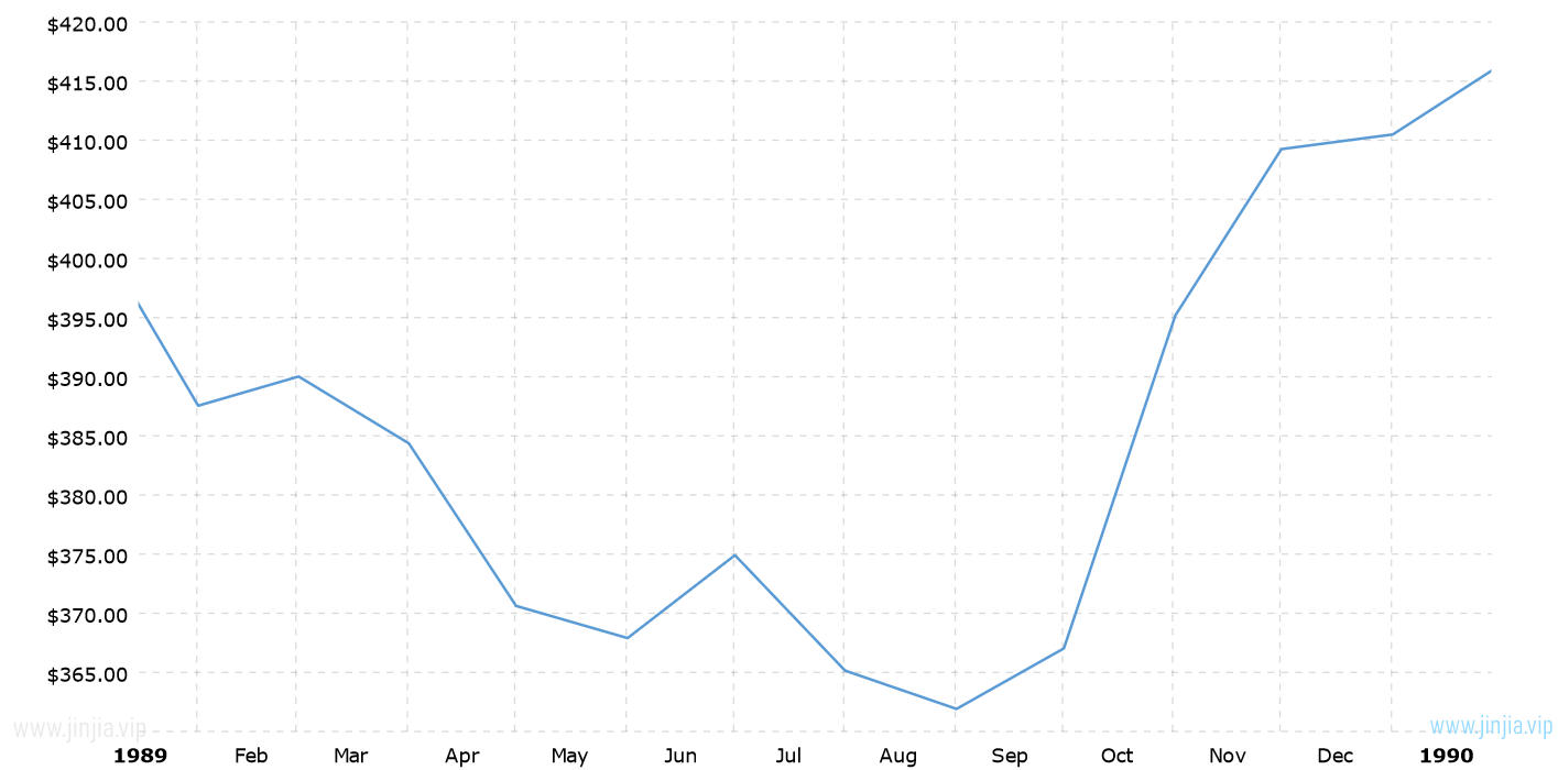 1989年金價 1989年黃金價格走勢圖 報價單位:美元/盎司 黃金歷年價格查詢 請選取年份 2026年 2025年 2024年 2023年 2022年 2021年 2020年 2019年 2018年 2017年 2016年 2015年 2014年 2013年 2012年 2011年 2010年 2009年 2008年 2007年 2006年 2005年 2004年 2003年 2002年 2001年 2000年 1999年 1998年 1997年 1996年 1995年 1994年 1993年 1992年 1991年 1990年 1989年 1988年 1987年 1986年 1985年 1984年 1983年 1982年 1981年 1980年 1979年 1978年 1977年 1976年 1975年 1974年 1973年 1972年 1971年 1970年 1969年 1968年 1967年 1966年 1965年 1964年 1963年 1962年 1961年 1960年 1959年 1958年 1957年 1956年 1955年 1954年 1953年 1952年 1951年 1950年 1949年 1948年 1947年 1946年 1945年 1944年 1943年 1942年 1941年 1940年 1939年 1938年 1937年 1936年 1935年 1934年 1933年 1932年 1931年 1930年 1929年 1928年 1927年 1926年 1925年 1924年 1923年 1922年 1921年 1920年 1919年 1918年 1917年 1916年 1915年 國際黃金歷史價格走勢圖 半年 1年 10年 20年 30年 50年 1989年金價查詢說明 1989年(民國78年)金價走勢圖的數據來自英國倫敦黃金交易市場(Gold Market,International Gold Market)的現貨歷史金價,以美元每盎司計價,本站查詢對使用該1989黃金價格歷史圖和數據表導致的結果概不承擔任何責任。 民國78年金價相關數據參考 倫敦金 紐約金 上海金 歷年金價 歷年銀價 歷年鉑價 歷年鈀價 換算 銀價 鉑價 鈀價