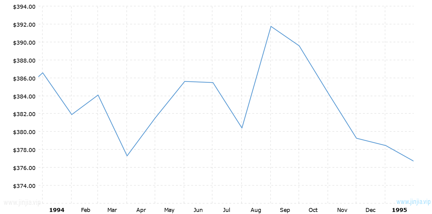 1994年金價 1994年黃金價格走勢圖 報價單位:美元/盎司 黃金歷年價格查詢 請選取年份 2026年 2025年 2024年 2023年 2022年 2021年 2020年 2019年 2018年 2017年 2016年 2015年 2014年 2013年 2012年 2011年 2010年 2009年 2008年 2007年 2006年 2005年 2004年 2003年 2002年 2001年 2000年 1999年 1998年 1997年 1996年 1995年 1994年 1993年 1992年 1991年 1990年 1989年 1988年 1987年 1986年 1985年 1984年 1983年 1982年 1981年 1980年 1979年 1978年 1977年 1976年 1975年 1974年 1973年 1972年 1971年 1970年 1969年 1968年 1967年 1966年 1965年 1964年 1963年 1962年 1961年 1960年 1959年 1958年 1957年 1956年 1955年 1954年 1953年 1952年 1951年 1950年 1949年 1948年 1947年 1946年 1945年 1944年 1943年 1942年 1941年 1940年 1939年 1938年 1937年 1936年 1935年 1934年 1933年 1932年 1931年 1930年 1929年 1928年 1927年 1926年 1925年 1924年 1923年 1922年 1921年 1920年 1919年 1918年 1917年 1916年 1915年 國際黃金歷史價格走勢圖 半年 1年 10年 20年 30年 50年 1994年金價查詢說明 1994年(民國83年)金價走勢圖的數據來自英國倫敦黃金交易市場(Gold Market,International Gold Market)的現貨歷史金價,以美元每盎司計價,本站查詢對使用該1994黃金價格歷史圖和數據表導致的結果概不承擔任何責任。 民國83年金價相關數據參考 倫敦金 紐約金 上海金 歷年金價 歷年銀價 歷年鉑價 歷年鈀價 換算 銀價 鉑價 鈀價