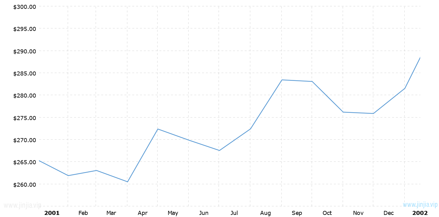 2001年金價 2001年黃金價格走勢圖 報價單位:美元/盎司 黃金歷年價格查詢 請選取年份 2026年 2025年 2024年 2023年 2022年 2021年 2020年 2019年 2018年 2017年 2016年 2015年 2014年 2013年 2012年 2011年 2010年 2009年 2008年 2007年 2006年 2005年 2004年 2003年 2002年 2001年 2000年 1999年 1998年 1997年 1996年 1995年 1994年 1993年 1992年 1991年 1990年 1989年 1988年 1987年 1986年 1985年 1984年 1983年 1982年 1981年 1980年 1979年 1978年 1977年 1976年 1975年 1974年 1973年 1972年 1971年 1970年 1969年 1968年 1967年 1966年 1965年 1964年 1963年 1962年 1961年 1960年 1959年 1958年 1957年 1956年 1955年 1954年 1953年 1952年 1951年 1950年 1949年 1948年 1947年 1946年 1945年 1944年 1943年 1942年 1941年 1940年 1939年 1938年 1937年 1936年 1935年 1934年 1933年 1932年 1931年 1930年 1929年 1928年 1927年 1926年 1925年 1924年 1923年 1922年 1921年 1920年 1919年 1918年 1917年 1916年 1915年 國際黃金歷史價格走勢圖 半年 1年 10年 20年 30年 50年 2001年金價查詢說明 2001年(民國90年)金價走勢圖的數據來自英國倫敦黃金交易市場(Gold Market,International Gold Market)的現貨歷史金價,以美元每盎司計價,本站查詢對使用該2001黃金價格歷史圖和數據表導致的結果概不承擔任何責任。 民國90年金價相關數據參考 倫敦金 紐約金 上海金 歷年金價 歷年銀價 歷年鉑價 歷年鈀價 換算 銀價 鉑價 鈀價