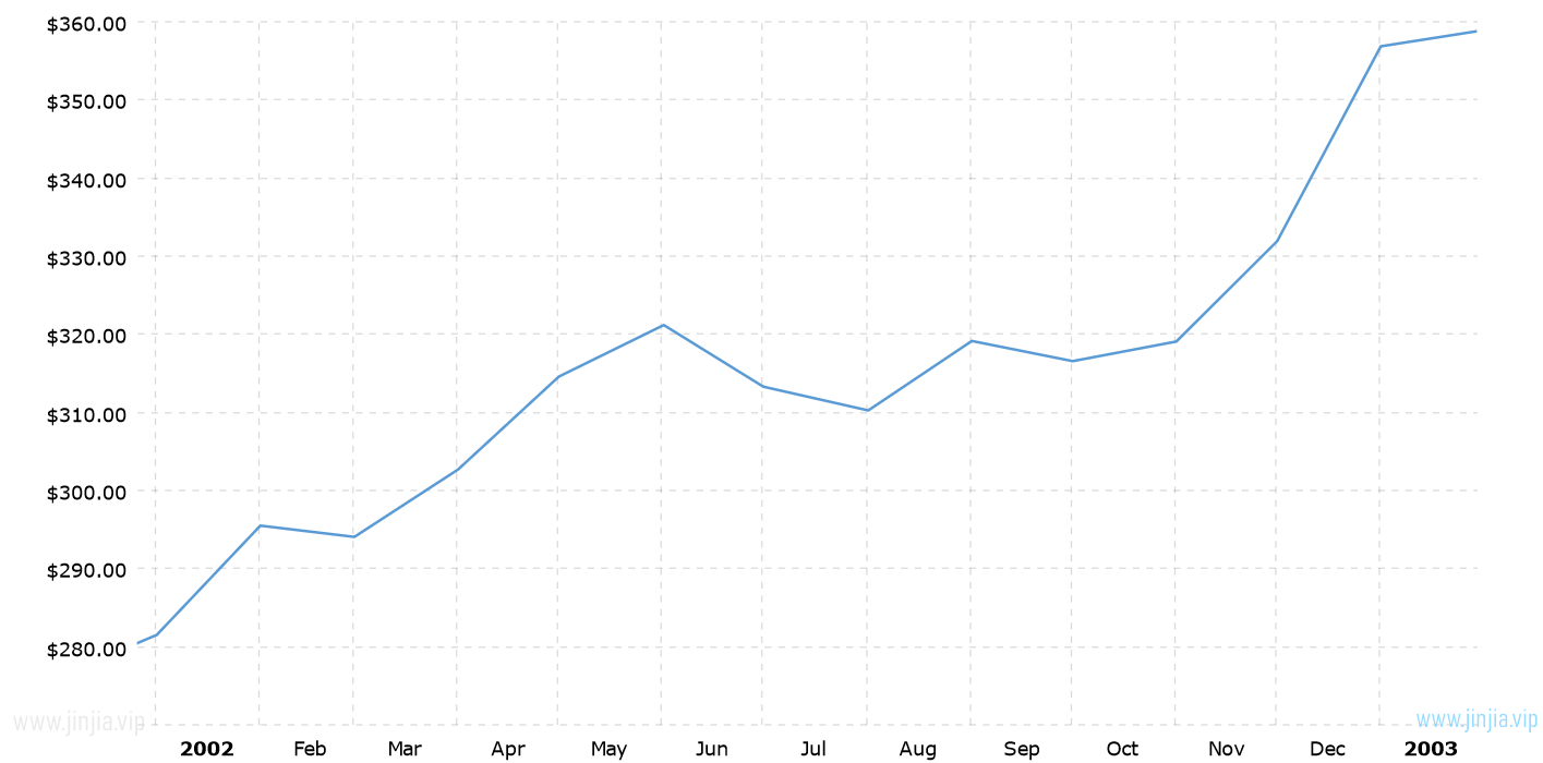 2002年金價 2002年黃金價格走勢圖 報價單位:美元/盎司 黃金歷年價格查詢 請選取年份 2026年 2025年 2024年 2023年 2022年 2021年 2020年 2019年 2018年 2017年 2016年 2015年 2014年 2013年 2012年 2011年 2010年 2009年 2008年 2007年 2006年 2005年 2004年 2003年 2002年 2001年 2000年 1999年 1998年 1997年 1996年 1995年 1994年 1993年 1992年 1991年 1990年 1989年 1988年 1987年 1986年 1985年 1984年 1983年 1982年 1981年 1980年 1979年 1978年 1977年 1976年 1975年 1974年 1973年 1972年 1971年 1970年 1969年 1968年 1967年 1966年 1965年 1964年 1963年 1962年 1961年 1960年 1959年 1958年 1957年 1956年 1955年 1954年 1953年 1952年 1951年 1950年 1949年 1948年 1947年 1946年 1945年 1944年 1943年 1942年 1941年 1940年 1939年 1938年 1937年 1936年 1935年 1934年 1933年 1932年 1931年 1930年 1929年 1928年 1927年 1926年 1925年 1924年 1923年 1922年 1921年 1920年 1919年 1918年 1917年 1916年 1915年 國際黃金歷史價格走勢圖 半年 1年 10年 20年 30年 50年 2002年金價查詢說明 2002年(民國91年)金價走勢圖的數據來自英國倫敦黃金交易市場(Gold Market,International Gold Market)的現貨歷史金價,以美元每盎司計價,本站查詢對使用該2002黃金價格歷史圖和數據表導致的結果概不承擔任何責任。 民國91年金價相關數據參考 倫敦金 紐約金 上海金 歷年金價 歷年銀價 歷年鉑價 歷年鈀價 換算 銀價 鉑價 鈀價