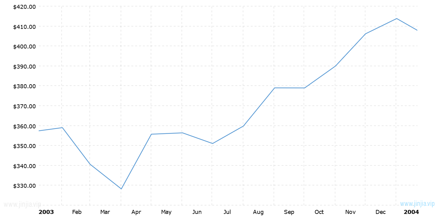 2003年金價 2003年黃金價格走勢圖 報價單位:美元/盎司 黃金歷年價格查詢 請選取年份 2026年 2025年 2024年 2023年 2022年 2021年 2020年 2019年 2018年 2017年 2016年 2015年 2014年 2013年 2012年 2011年 2010年 2009年 2008年 2007年 2006年 2005年 2004年 2003年 2002年 2001年 2000年 1999年 1998年 1997年 1996年 1995年 1994年 1993年 1992年 1991年 1990年 1989年 1988年 1987年 1986年 1985年 1984年 1983年 1982年 1981年 1980年 1979年 1978年 1977年 1976年 1975年 1974年 1973年 1972年 1971年 1970年 1969年 1968年 1967年 1966年 1965年 1964年 1963年 1962年 1961年 1960年 1959年 1958年 1957年 1956年 1955年 1954年 1953年 1952年 1951年 1950年 1949年 1948年 1947年 1946年 1945年 1944年 1943年 1942年 1941年 1940年 1939年 1938年 1937年 1936年 1935年 1934年 1933年 1932年 1931年 1930年 1929年 1928年 1927年 1926年 1925年 1924年 1923年 1922年 1921年 1920年 1919年 1918年 1917年 1916年 1915年 國際黃金歷史價格走勢圖 半年 1年 10年 20年 30年 50年 2003年金價查詢說明 2003年(民國92年)金價走勢圖的數據來自英國倫敦黃金交易市場(Gold Market,International Gold Market)的現貨歷史金價,以美元每盎司計價,本站查詢對使用該2003黃金價格歷史圖和數據表導致的結果概不承擔任何責任。 民國92年金價相關數據參考 倫敦金 紐約金 上海金 歷年金價 歷年銀價 歷年鉑價 歷年鈀價 換算 銀價 鉑價 鈀價