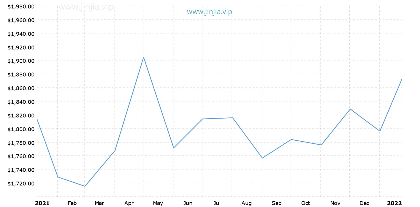 2021年金價 2021年黃金價格走勢圖 報價單位:美元/盎司 黃金歷年價格查詢 請選取年份 2026年 2025年 2024年 2023年 2022年 2021年 2020年 2019年 2018年 2017年 2016年 2015年 2014年 2013年 2012年 2011年 2010年 2009年 2008年 2007年 2006年 2005年 2004年 2003年 2002年 2001年 2000年 1999年 1998年 1997年 1996年 1995年 1994年 1993年 1992年 1991年 1990年 1989年 1988年 1987年 1986年 1985年 1984年 1983年 1982年 1981年 1980年 1979年 1978年 1977年 1976年 1975年 1974年 1973年 1972年 1971年 1970年 1969年 1968年 1967年 1966年 1965年 1964年 1963年 1962年 1961年 1960年 1959年 1958年 1957年 1956年 1955年 1954年 1953年 1952年 1951年 1950年 1949年 1948年 1947年 1946年 1945年 1944年 1943年 1942年 1941年 1940年 1939年 1938年 1937年 1936年 1935年 1934年 1933年 1932年 1931年 1930年 1929年 1928年 1927年 1926年 1925年 1924年 1923年 1922年 1921年 1920年 1919年 1918年 1917年 1916年 1915年 國際黃金歷史價格走勢圖 半年 1年 10年 20年 30年 50年 2021年金價查詢說明 2021年(民國110年)金價走勢圖的數據來自英國倫敦黃金交易市場(Gold Market,International Gold Market)的現貨歷史金價,以美元每盎司計價,本站查詢對使用該2021黃金價格歷史圖和數據表導致的結果概不承擔任何責任。 民國110年金價相關數據參考 倫敦金 紐約金 上海金 歷年金價 歷年銀價 歷年鉑價 歷年鈀價 換算 銀價 鉑價 鈀價