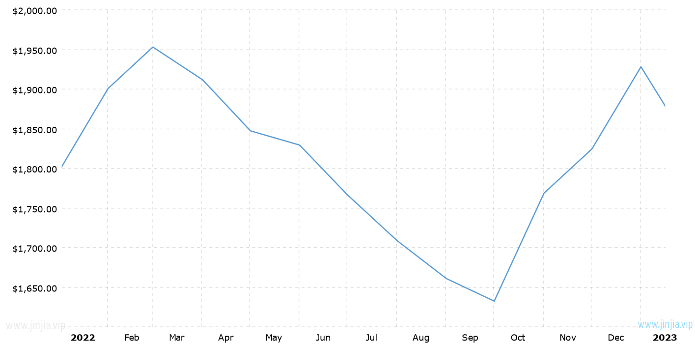 2022年金價 2022年黃金價格走勢圖 報價單位:美元/盎司 黃金歷年價格查詢 請選取年份 2026年 2025年 2024年 2023年 2022年 2021年 2020年 2019年 2018年 2017年 2016年 2015年 2014年 2013年 2012年 2011年 2010年 2009年 2008年 2007年 2006年 2005年 2004年 2003年 2002年 2001年 2000年 1999年 1998年 1997年 1996年 1995年 1994年 1993年 1992年 1991年 1990年 1989年 1988年 1987年 1986年 1985年 1984年 1983年 1982年 1981年 1980年 1979年 1978年 1977年 1976年 1975年 1974年 1973年 1972年 1971年 1970年 1969年 1968年 1967年 1966年 1965年 1964年 1963年 1962年 1961年 1960年 1959年 1958年 1957年 1956年 1955年 1954年 1953年 1952年 1951年 1950年 1949年 1948年 1947年 1946年 1945年 1944年 1943年 1942年 1941年 1940年 1939年 1938年 1937年 1936年 1935年 1934年 1933年 1932年 1931年 1930年 1929年 1928年 1927年 1926年 1925年 1924年 1923年 1922年 1921年 1920年 1919年 1918年 1917年 1916年 1915年 國際黃金歷史價格走勢圖 半年 1年 10年 20年 30年 50年 2022年金價查詢說明 2022年(民國111年)金價走勢圖的數據來自英國倫敦黃金交易市場(Gold Market,International Gold Market)的現貨歷史金價,以美元每盎司計價,本站查詢對使用該2022黃金價格歷史圖和數據表導致的結果概不承擔任何責任。 民國111年金價相關數據參考 倫敦金 紐約金 上海金 歷年金價 歷年銀價 歷年鉑價 歷年鈀價 換算 銀價 鉑價 鈀價