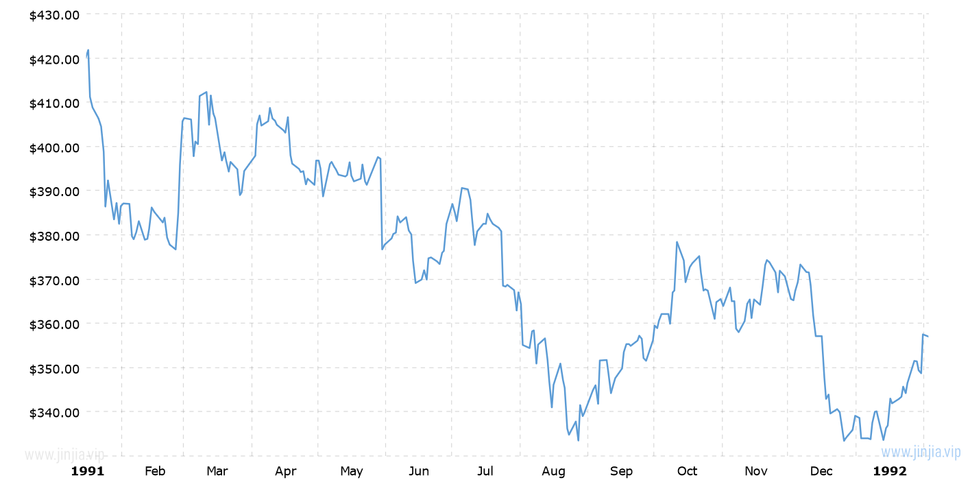 1991年鉑金價格 1991年鉑價走勢圖 報價單位:美元/盎司 鉑金歷年價格查詢 請選取報價年份 2025年 2024年 2023年 2022年 2021年 2020年 2019年 2018年 2017年 2016年 2015年 2014年 2013年 2012年 2011年 2010年 2009年 2008年 2007年 2006年 2005年 2004年 2003年 2002年 2001年 2000年 1999年 1998年 1997年 1996年 1995年 1994年 1993年 1992年 1991年 1990年 1989年 1988年 1987年 1986年 1985年 1984年 1983年 1982年 1981年 1980年 1979年 1978年 1977年 1976年 1975年 1974年 1973年 1972年 1971年 1970年 1969年 國際鉑金歷史價格走勢圖 半年 1年 10年 20年 30年 50年 1991年鉑價格查詢說明 1991年(民國80年)鉑價走勢圖的數據來自英國倫敦現貨鉑金的歷史價格,以美元每盎司計價,本站查詢對使用該1991鉑金價格歷史圖和數據表導致的結果概不承擔任何責任。1991年金價 1991年銀價 民國80年鉑金價格相關數據參考 倫敦金 紐約金 上海金 歷年金價 歷年銀價 歷年鉑價 歷年鈀價 換算 銀價 鉑價 鈀價