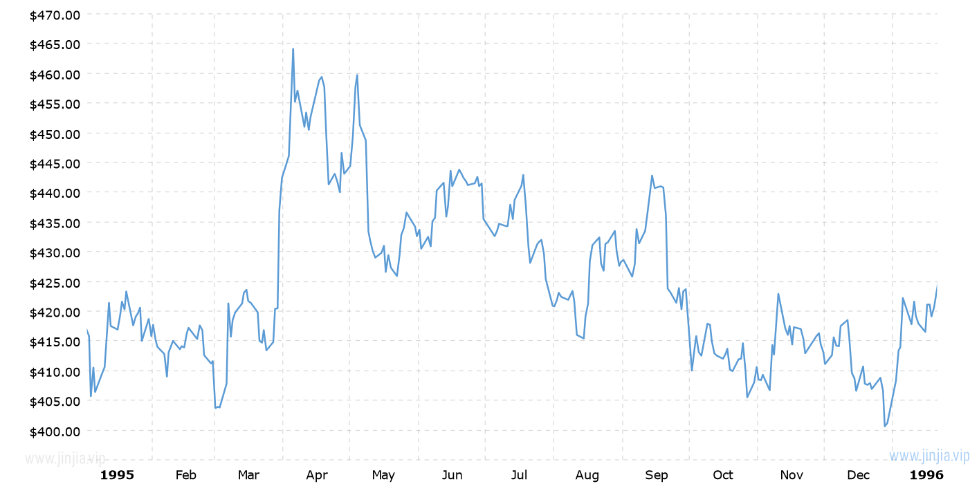 1995年鉑金價格 1995年鉑價走勢圖 報價單位:美元/盎司 鉑金歷年價格查詢 請選取報價年份 2025年 2024年 2023年 2022年 2021年 2020年 2019年 2018年 2017年 2016年 2015年 2014年 2013年 2012年 2011年 2010年 2009年 2008年 2007年 2006年 2005年 2004年 2003年 2002年 2001年 2000年 1999年 1998年 1997年 1996年 1995年 1994年 1993年 1992年 1991年 1990年 1989年 1988年 1987年 1986年 1985年 1984年 1983年 1982年 1981年 1980年 1979年 1978年 1977年 1976年 1975年 1974年 1973年 1972年 1971年 1970年 1969年 國際鉑金歷史價格走勢圖 半年 1年 10年 20年 30年 50年 1995年鉑價格查詢說明 1995年(民國84年)鉑價走勢圖的數據來自英國倫敦現貨鉑金的歷史價格,以美元每盎司計價,本站查詢對使用該1995鉑金價格歷史圖和數據表導致的結果概不承擔任何責任。1995年金價 1995年銀價 民國84年鉑金價格相關數據參考 倫敦金 紐約金 上海金 歷年金價 歷年銀價 歷年鉑價 歷年鈀價 換算 銀價 鉑價 鈀價